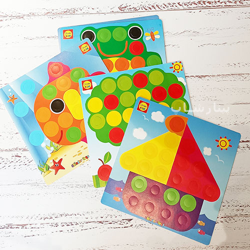 هر بار یک کارت را روی پایه قرار داده از کودک میخواهیم با دکمههای رنگی آن را کامل کند. با این کار علاوه بر شناخت رنگها و زبانآموزی، قوهی تخیل کودکان نیز پرورش مییابد و بر خلاقیت آنان افزوده میگردد.